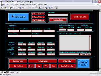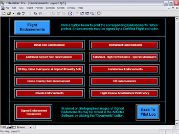 This screen displays the Pilot Log area of AirNotes™ software. Here, users can keep a complete log of all of their flights. Additionally, from this main Pilot Log Section, users may enter one of three sub-sections. These include the Pilot's Classifications Sub-Section, the Aircraft Flown Sub-Section, and the Endorsements Sub-Section. In the Endorsements Sub-Section, pilots may fill out and print any or all possible endorsement certificates, have them signed by the appropriate authorities, then scan them back into the AirNotes™ for safekeeping.