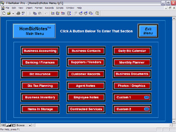 Upon entering the HomBizNotes™ program, this Site Map appears. This Site Map displays links that lead users to each of the eighteen Main Sections of the HomBizNotes™ program. This is the most comprehensive home business management software available. Just look at all that is available to you. And, it could even be used for multiple businesses! Notice, too, that there are two Custom Entry areas. If, by chance, there is some type of information that doesn't fit into one of the Sections provided, this enables users to tailor HomBizNotes™ to their specific needs. In addition, within each of the Main Sections there are sub-categories, each of which may be completely customized to make this program the most effective for each individual user. Clicking on a Main Section button will move users to that Main Section's data entry screen. |
