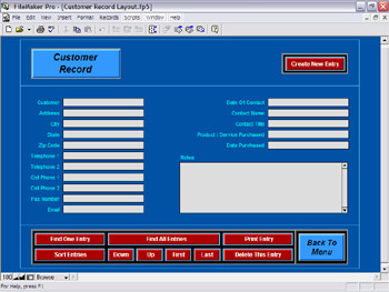 This screen displays the Customer Record Section of the HomBizNotes™ program. This Customer Record Section, as the name suggests, will allow business owners to quickly and easily organize all of their customer records. All types of information can be recorded here-- things like products ordered, dates ordered, method of payment, timeliness of payment, etc. Customer Records can be printed for filing, as well as kept in the program for any future reference. |