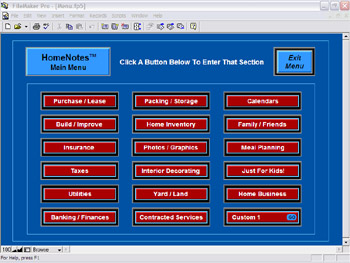 Upon entering the HomeNotes™ program, this Site Map appears. This Site Map displays links that lead users to each of the eighteen Main Sections of the HomeNotes™ program. This is the most comprehensive household management software available. Just look at all that is available to you. And, it can be used for multiple homes! Notice, too, that there is a Custom Entry area. If, by chance, there is some type of information that doesn't fit into one of the Sections provided, this enables users to tailor HomeNotes™ to their specific needs. In addition, within each of the Main Sections there are sub-categories, each of which may be completely customized to make this program the most effective for each individual user. Clicking on a Main Section button will move users to that Main Section's data entry screen. |