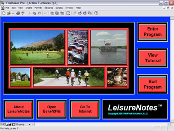 This is the opening screen of the LeisureNotes™ Software program. From this opening screen, users can view the LeisureNotes™ Tutorial, go to a pre-programmed, direct-linked, Internet website, open supplied BenefitFiles™ or enter the Main Program. (Details regarding BenefitFiles™ are provided elsewhere on ReFind Solutions' website) |