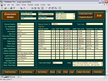 Upon entering the Log Section of the LunkerNotes™ program, this screen appears. This screen displays all of the data entry fields available to users in the LunkerNotes™ program. This is the most comprehensive catch management software available. Just look at all that is available to users. And, it can be used by multiple fishermen! The most effective use of this program is as follows. For every fishing excursion users embark upon, they will enter data related to the weather conditions, water conditions, their daily catch, the bait or tackle used, and a host of other information. As users enter the sizes of the fish they catch, LunkerNotes™ will even automatically calculate the total weight of the catch. Then, when this data is entered, LunkerNotes™ will store it until the users are ready to perform some of the unique functions of LunkerNotes™ that will actually enable them to catch more fish on their next excursions. |