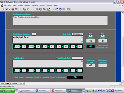 Each assignment or test is assigned a grade item number. Each grade item number can be assigned a different scoring parameter or grading curve. Once the scoring parameter is set, the students’ assignment or test scores can be entered, and PhysAssist™ will then automatically calculate a grade value based on whatever system the teacher employs.