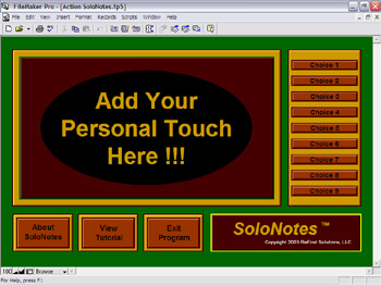 SoloNotes™ products are designed by you, the individual, and can be customized for your particular needs. These editions are typically developed by assembling a few chosen features and functions from one or more of Refind Solutions' retail software products. In some instances, Solo Editions may also include certain new features and functions that you may request. Although Solo Edition products are usually similar in product architecture, they are unique in that they can display custom graphics and color coordination that you may specify. Here's you chance to develop the software program that you've always wished you had! |