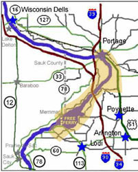 This circle tour is designed for use from April 15th thru November 30th to coincide with the seasonal operation of the Colsac III Free Ferry which crosses Lake Wisconsin. In season the Ferry operates 24 hours a day, 7 days each week. The Ferry is closed during the winter. An early thaw or late freeze may alter operation dates. You may confirm ferry operation by calling this number: (608)246-3871. |