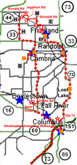 Have you ever driven across a wooden bridge at 5mph and heard the clunkety-clunk of the plank deck as it rises and falls under your wheels? If not, you are among a vast majority of people who will probably never drive across a wooden highway bridge, unless you visit the Bridges of Columbia County! Re-live the early days of the 1900s when wooden bridges dotted the landscape and the standard vehicle in rural America was the horse and buggy! See 4 wooden bridges, 1 remodeled with a steel deck, and 2 cement arch bridges - plus an old and almost forgotten steel bridge crossing the Crawfish River at Columbus. Make a day of it! Plenty of other points of interest along the way for your enjoyment. A statue of Christopher Columbus just outside the City of Columbus on Hwy 16. Beautiful scenery along our Columbia County roads. Plenty of places to eat and shop in each town...and along the rural roads of the tour. Click-On a name link below to learn more about the rural businesses and community businesses represented by the orange squares on the map. The community links contain multiple listings:
