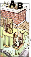 Just as easy a one spark flitting through a crack in flue marked "A" or an ember igniting a chimney fire which climbs the chimney searching for an escape route - that can cause a house fire. |