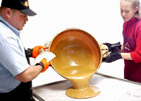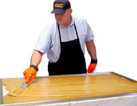 Hands That Is... Very hot kettles make this process a two person task. Pouring the toffee onto a large marble slab. |