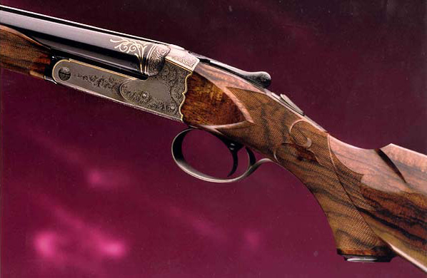 A Winchester Model 21, 20 gauge shotgun. The action was scalloped and the side panels and fences were reshaped. A new safety was added and the top lever was modified. A beaded trigger guard was fabricated. The English walnut stock is checkered in a fleur de lis pattern similar to high grade Fox shotguns.